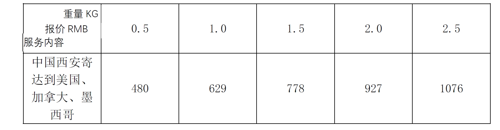 | 备注:(1)计价单位为人民币,以上报价不含税费,燃油附加费等。(2)仅限2.5KG(公斤)以及以内的包裹。(3)不足0.5 KG(公斤)的,按0.5 KG(公斤)计。(4)计费重量,以体积重(换算标准为5000)和实物重相比后,较大者为准。(5)本公司保留随时根据市场需求调整价格的权利。 |
